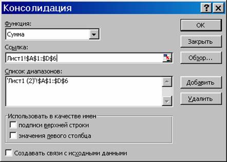 Короткі теоретичні відомостіНа практиці дуже часто виникає потреба підведення підсумків за даними, розташованим на різних робочих аркушах. Нехай, наприклад, є 12 робочих аркушів, розташованих в одному або декількох файлах, кожний з який містить відомості про діяльність підприємства за місяць. На основі цих даних потрібно створити новий робочий аркуш, де б підводилися підсумки діяльності за рік. Подібні задачі можна легко вирішити, скориставшись опцією Консолидация з меню Данные. Вона дозволяє підсумувати або якось інакше підвести підсумки, базуючись на даних у відповідних комірках робочих аркушів що містять вхідні дані.